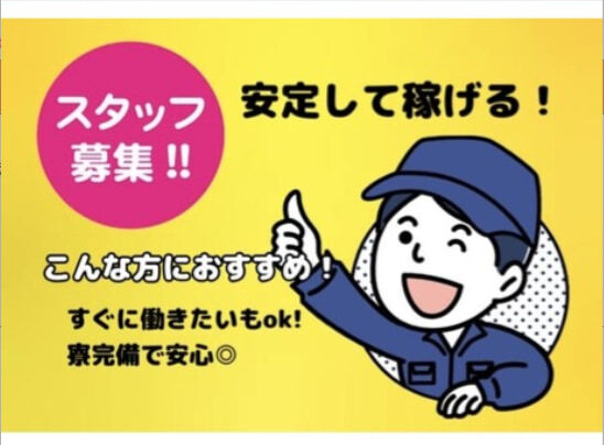 | 待遇 | ・交通費全額支給 ・日払い、週払い対応OK※ご相談ください ・寮完備(家具家電付きのワンルームマンション) ・制服貸出 ・資格取得制度あり 【社会保険】 ・厚生年金 ・健康保険 ・雇用保険 ・労災保険 【受動喫煙対策】 ・屋外喫煙可 |