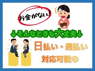 待遇 | ・交通費全額支給 ・日払い、週払い対応OK※ご相談ください ・寮完備(家具家電付きのワンルームマンション) ・制服貸出 ・資格取得制度あり 【社会保険】 ・厚生年金 ・健康保険 ・雇用保険 ・労災保険 【受動喫煙対策】 ・屋外喫煙可 |